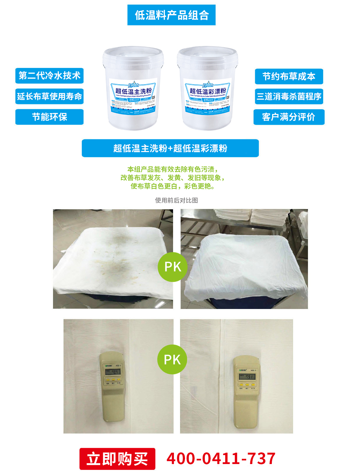 本組產(chǎn)品能有效去除有色污漬,改善布草發(fā)灰、發(fā)黃、發(fā)舊等現(xiàn)象,使布草白色更白,彩色更艷。