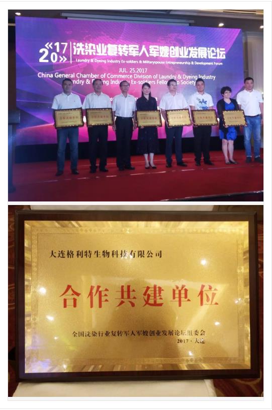 2017年7月25日洗染業(yè)復(fù)轉(zhuǎn)軍人軍嫂創(chuàng)業(yè)發(fā)展論壇曁軍人俱樂部聯(lián)誼活動在大連圓滿結(jié)束。大連市洗染行業(yè)協(xié)會副會長、大連市洗染行業(yè)協(xié)會公用紡織品辦公室主任、大連格利特生物科技有限公司董事長延金祥先生上臺領(lǐng)取“合作共建單位”稱號獎牌。